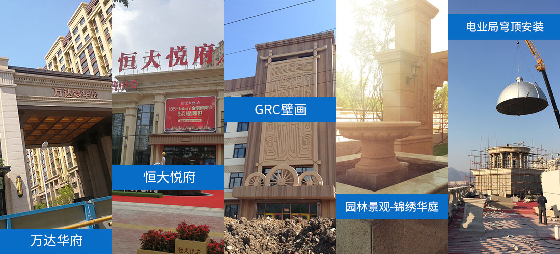 本企業(yè)的產(chǎn)品被廣泛應用于建筑室內及外墻的裝飾、裝修工程和市政、園林景觀的造景等。主要產(chǎn)品有檐線、門窗裝飾線、穹頂、扶手墩、山花、浮雕裝飾板、中式西式的傳統(tǒng)裝飾、歐式羅馬裝飾柱、仿蘑菇石、仿剁斧石、仿干粘石、假山、噴泉、圓雕、藝術壁畫、外墻掛板、室內石膏線、燈盤、浮雕、羅馬柱等。均可根據(jù)客